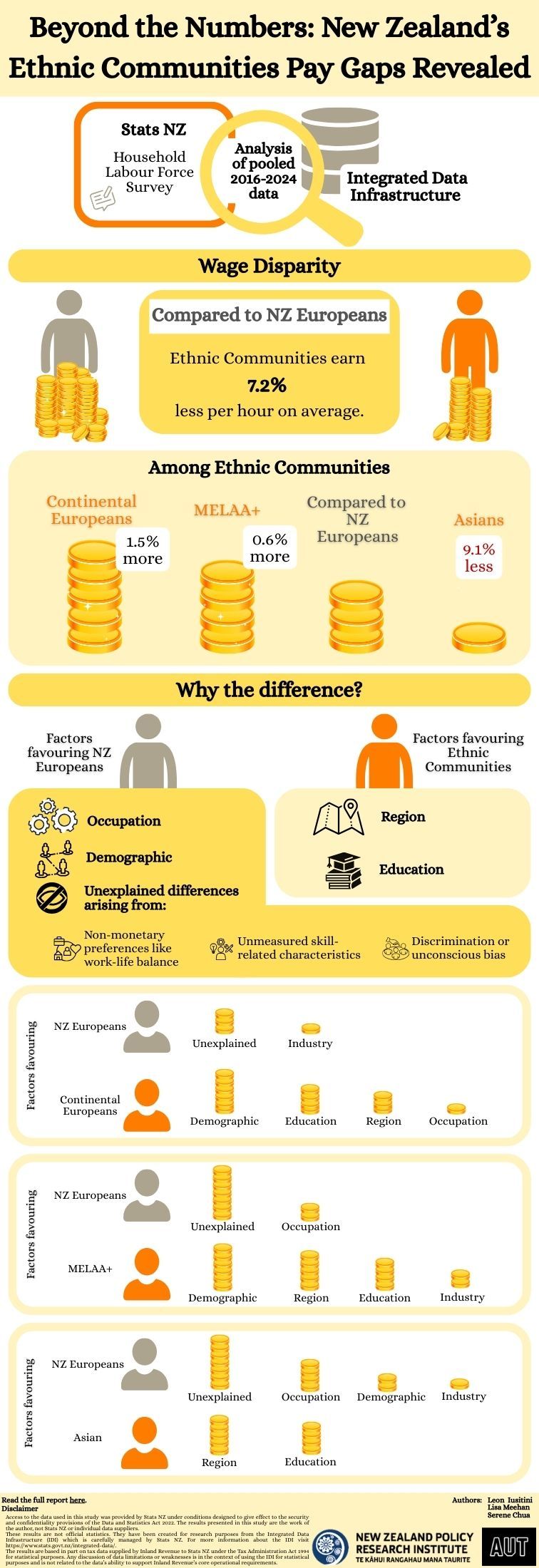This report provides the most detailed analysis to date of pay gaps between Aotearoa New Zealand’s Ethnic Communities and NZ Europeans. Using data from Stats NZ’s Household Labour Force Survey (2016–2024) and the Integrated Data Infrastructure, it finds that Ethnic Communities face an average pay gap of 7.2%. Outcomes vary widely across subgroups: Asian and Latin American workers experience wage penalties of up to 14%, while Continental European, Middle Eastern, and African+ workers often earn more than NZ Europeans. Despite generally higher education levels and favourable demographic profiles, many groups still face unexplained pay disparities, highlighting the potential role of structural barriers in the labour market.
